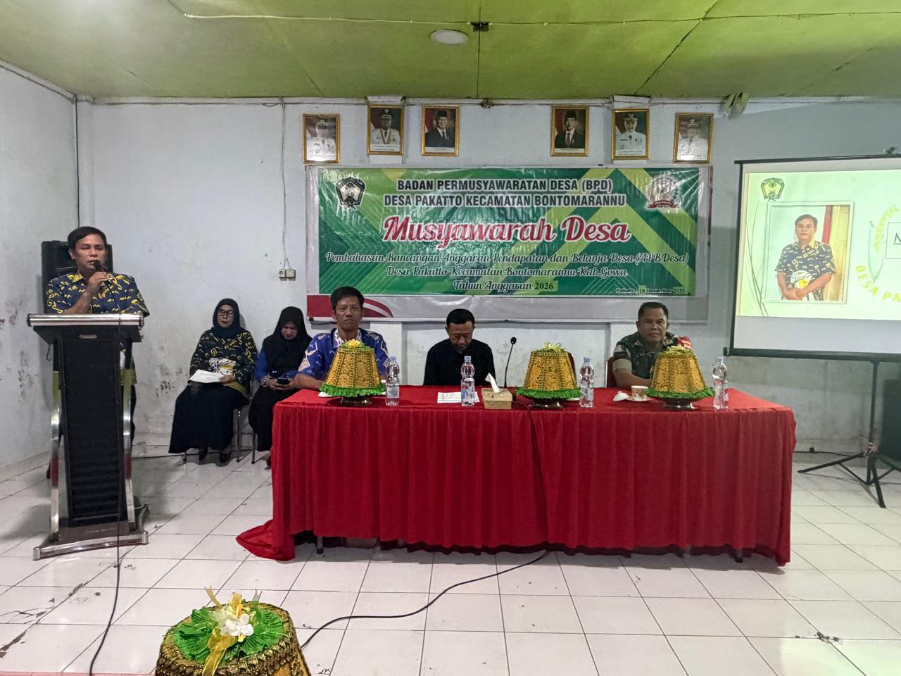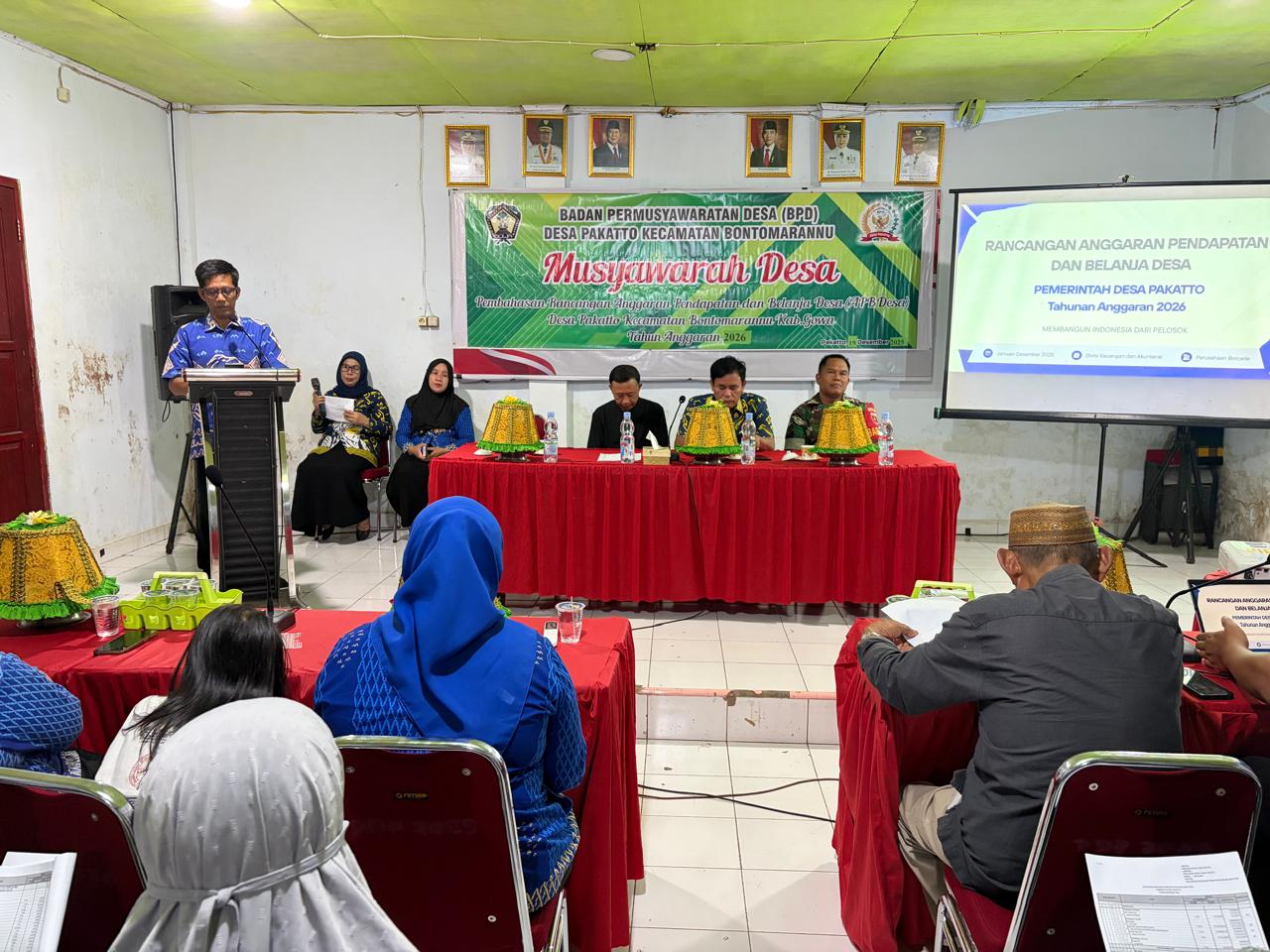 Aula Kantor Desa Pakatto, Bontomarannu – Pemerintah Desa Pakatto Kecamatan Bontomarannu Kabupaten Gowa menghadiri Musyawarah Desa yang diselenggarakan oleh Badan Permusyawaratan Desa (BPD) Desa Pakatto pada tanggal 19 Desember 2025. Musyawarah ini membahas Rancangan Anggaran Pendapatan dan Belanja Desa (APBDes) tahun anggaran 2026. Kegiatan yang bertempat di aula kantor Desa Pakatto ini dihadiri oleh Kepala Desa Pakatto, Basir, SE, Ketua BPD Muh Yusuf Gani beserta anggota BPD Desa Pakatto, Babinsa Desa Pakatto Serma Tajuddin, Pendamping Desa, Sekretaris Desa dan Aparatur Desa Pakatto, para Kepala Dusun se-Desa Pakatto, tokoh masyarakat, tokoh agama, tokoh pendidik, perwakilan perempuan, dan perwakilan penyandang disabilitas. Musyawarah tersebut membahas secara rinci beberapa poin penting dalam rancangan APBDes, meliputi: Pendapatan Asli Desa dan Pendapatan Lain-Lain, Belanja Bidang Penyelenggaraan Pemerintahan Desa, Belanja Bidang Pelaksanaan Pembangunan Desa, Belanja Bidang Pembinaan Kemasyarakatan, Belanja Bidang Pemberdayaan Masyarakat, serta Belanja Penanggulangan Bencana, Darurat dan Mendesak Desa. Selain pembahasan anggaran, forum musyawarah juga mengevaluasi rancangan pembahasan APBDes yang telah disusun oleh PPKD (Pelaksana Pengelola Keuangan Desa). Evaluasi ini bertujuan untuk menentukan prioritas program dan kegiatan yang akan dilaksanakan pada tahun anggaran 2026. Sudirman Penulis: